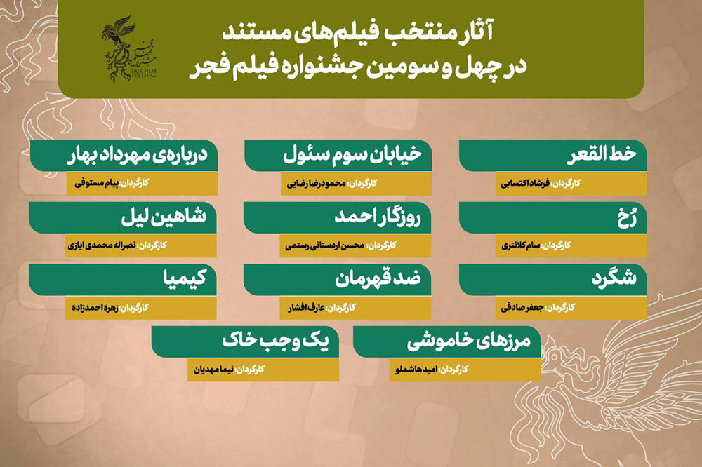 به گزارش خبرگزاری مهر به نقل از روابط عمومی جشنواره، با اعلام هیئت داوران آثار مستند سینمایی جشنواره فیلم فجر متشکل از محسن برمهانی (مدیر فرهنگی و مستندساز)، مهرداد زاهدیان (کارگردان مستند)، سعید رشتیان (تهیه‌کننده فیلم مستند)، محمد صوفی (تهیه‌کننده فیلم مستند)، پژمان مظاهری‌پور (کارگردان مستند)، میترا مهتریان (مستندساز